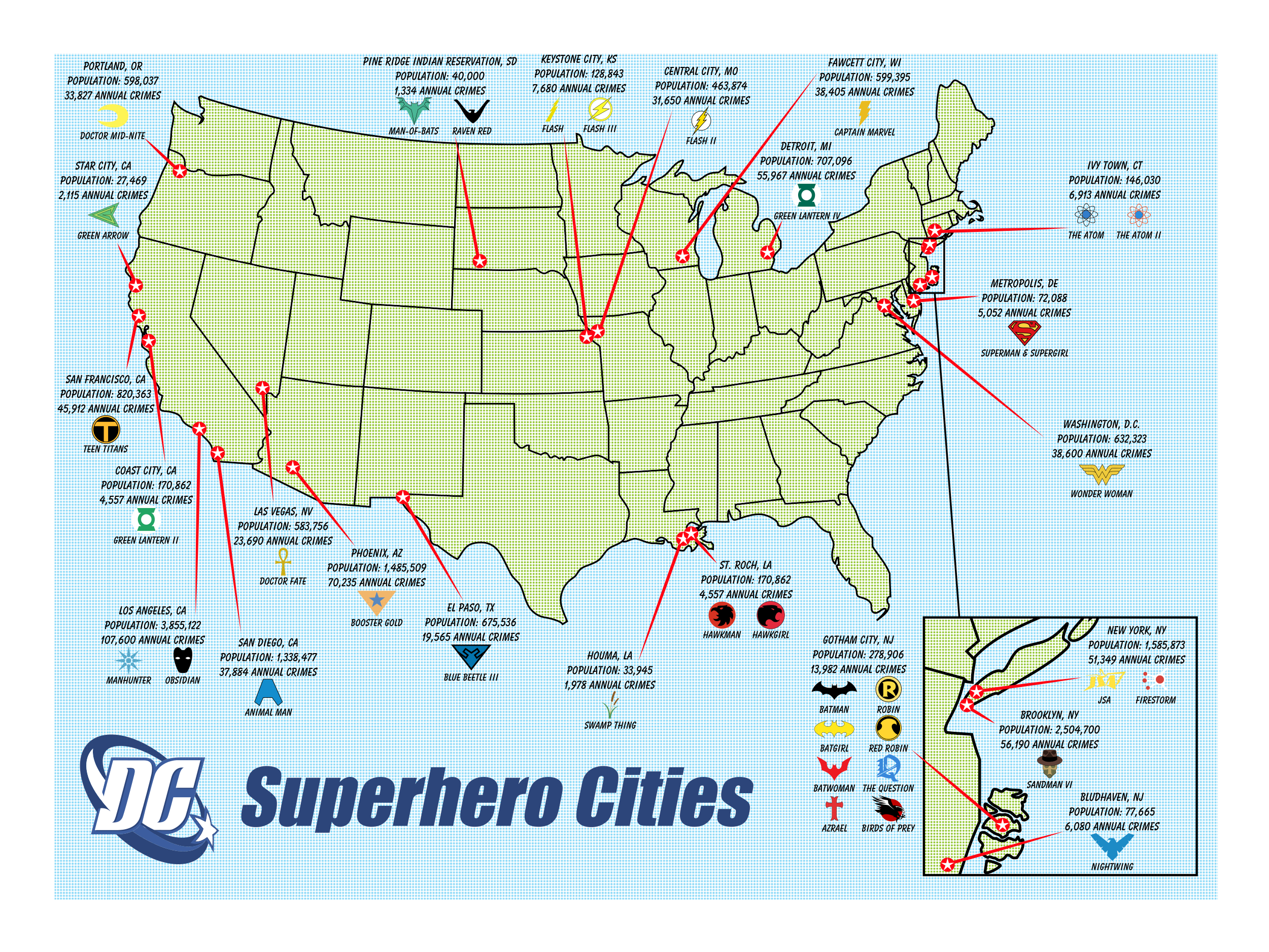 A map of all the DC cities and their repsective heroes