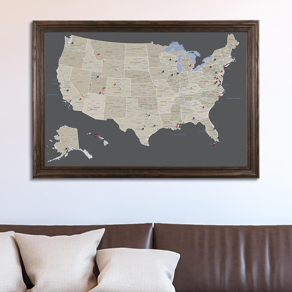 Earth Toned US Travel Map | Framed US 50 States Map Push Pin