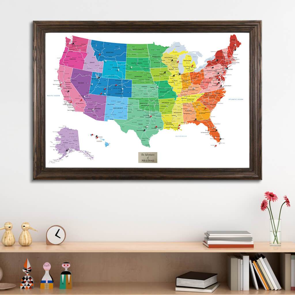 Colorful United States Map | Framed USA Map with Pins Push Pin